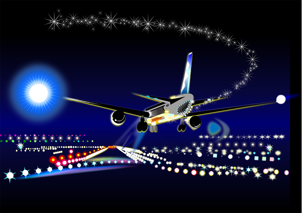 商品券5千円分色彩のコントラストがとっても美しく感じられます。夜空と滑走路の誘導灯の対比が非常に美しいです。静止画でありながら、弧を描く光のラインが、飛行機のスピード感を感じます。