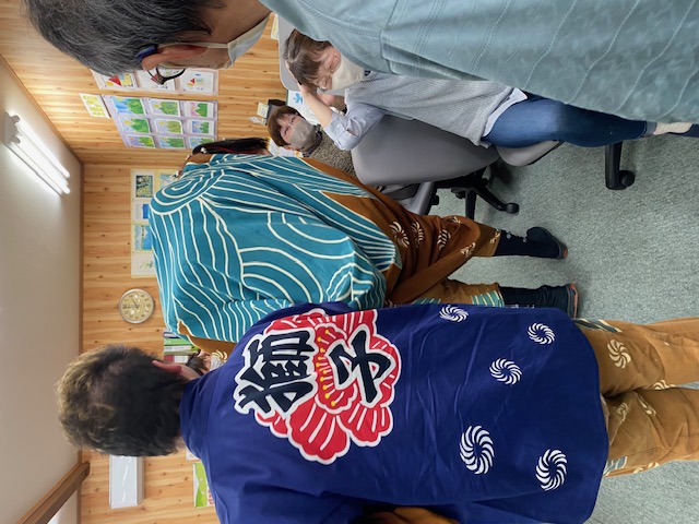 安志加茂神社の秋祭りに披露される獅子舞や天狗面の鼻高、花もちの3人が教室を訪問してくれました。