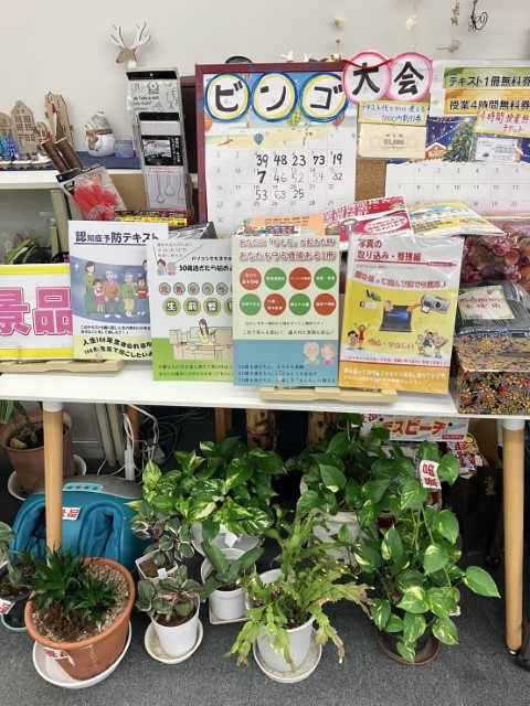 景品には、この日のために育てたたくさんの観葉植物、スタッフ・生徒様からの提供、テキスト割引券や無料授業チケット、参考資料として使っていた脳トレグッズなど。